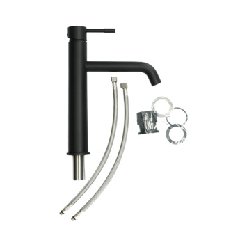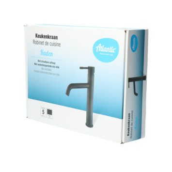 De Atlantic keukenkraan Kaden met hendel Zwart bestaat uit een keukenkraan met rechte hoge uitloop, 2 flexibele aansluitslangen, bevestigingsmateriaal en montagehandleiding. De Kaden keukenkraan heeft een draaibare uitloop van 360° waarmee je eenvoudig plaats maakt bij je gootsteen. Ook de hoge uitloop op 16 cm geeft ruimte. Handig als je bijvoorbeeld een grote pan of emmer wil vullen. Met de eenhendelbediening draai je met 1 hand de kraan naar de gewenste temperatuur. Draaien doe je soepel en nauwkeurig door de keramische schijven, die bovendien weinig onderhoud vergen. Je bespaart water door de ingebouwde eco-klik. Een ingebouwde weerstand in de hendel zorgt ervoor dat je de kraan niet direct op de hoogste straalstand zet. Daarmee bespaar je dus op je waterverbruik. Wens je toch een hardere straal, dan zet je de hendel wat verder open. Aan de anti-kalk perlator hecht kalk zich moeilijk vast en veeg je er met de hand af. Deze rechte keukenkraan met hoge uitloop heeft een mat zwarte afwerking en oogt daarmee robuust. Gebruik alleen water en een zachte doek om de kraan schoon te maken. Gebruik geen schurend, bijtend, azijnhoudend of agressief schoonmaakmiddel. Op de kraan heb je 5 jaar garantie.