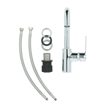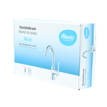 De Atlantic wastafelkraan Micah met hendel Chroom bestaat uit een verchroomde wastafelkraan van 27,1 cm hoog met 2 flexibele aansluitslangen, bevestigingsmateriaal en montagehandleiding. De kraan heeft een eenhendelbediening. Daarmee draai je eenvoudig met 1 hand de kraan naar de gewenste temperatuur. Je bespaart water door de ingebouwde eco-klik. Een ingebouwde weerstand in de hendel zorgt ervoor dat je de kraan niet direct op de hoogste straalstand zet. Wens je toch een hardere straal, dan zet je de hendel gewoon verder open. Aan de anti-kalk perlator hecht kalk zich moeilijk vast en veeg je er makkelijk met de hand af. Deze wastafelkraan heeft een mooie glanzende verchroomde afwerking. Gebruik alleen water en een zachte doek om de kraan schoon te maken. Gebruik geen schurend, bijtend, azijnhoudend of agressief schoonmaakmiddel. Op de kraan heb je 5 jaar garantie.