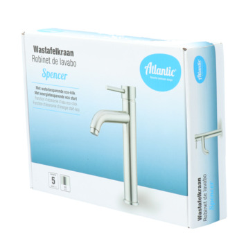 De Atlantic wastafelkraan Spencer met hendel RVS bestaat uit een RVS wastafelkraan van 25,5 cm hoog met 2 flexibele aansluitslangen, bevestigingsmateriaal en montagehandleiding. De Spencer wastafelkraan heeft een handige eenhendelbediening, waarmee je eenvoudig met 1 hand de kraan naar de gewenste temperatuur draait. Je bespaart water door de ingebouwde eco-klik. De ingebouwde weerstand in de hendel zorgt ervoor dat je de kraan niet direct op de hoogste straalstand zet. Wens je toch een hardere straal, dan zet je de hendel gewoon verder open. Eco start zorgt ervoor dat als de hendel in het midden staat, alleen koud water door de kraan stroomt. In tegenstelling tot standaard mengkranen waarbij warm water gemengd wordt in de middelste stand. Zo bespaar je naast water door eco-klik dus ook (warmte)energie door eco start. Aan de anti-kalk perlator hecht kalk zich moeilijk vast en veeg je er makkelijk met de hand af. Deze rechte wastafelkraan heeft een stoere uitstraling door de geborstelde afwerking. Gebruik alleen water en een zachte doek om de kraan schoon te maken. Gebruik geen schurend, bijtend, azijnhoudend of agressief schoonmaakmiddel. Besluit je deze kraan te kopen? Dan heb je 5 jaar garantie.