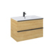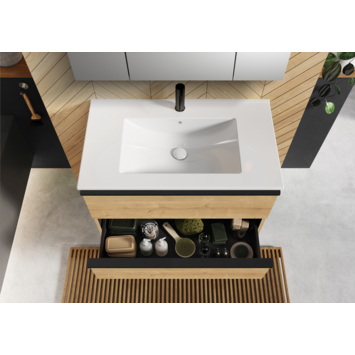 Het Atlantic badkamermeubel Aisa 80 cm in eik is een praktisch en strak meubel voor in elke badkamer. Met twee softclose-lades en extra hoogte heb je genoeg plek om handdoeken en verzorgingsproducten overzichtelijk op te bergen. De lange handgrepen lopen over de volledige breedte van de lades en maken openen en sluiten soepel en eenvoudig. Het meubel staat stabiel en biedt een solide basis voor een zelfgekozen wastafel uit de Kyra- of Skappa-lijn, beschikbaar in zwart, wit of kasjmir. Door de combinatie van eikenhout en RVS grepen oogt het geheel modern en rustig. Ideaal voor wie overzicht wil en gemak in gebruik. Stel je eigen combinatie samen en geef je badkamer direct een functionele upgrade.