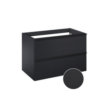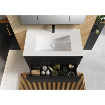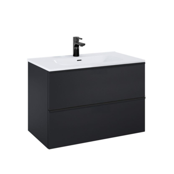 Het Atlantic badkamermeubel Aisa 80 cm in zwart combineert strak design met praktische opbergruimte. Met twee softclose-lades en extra hoogte heb je genoeg plek om handdoeken en verzorgingsproducten overzichtelijk op te bergen. De lange zwarte handgrepen over de volledige ladebreedte maken openen en sluiten soepel en eenvoudig. Het meubel staat stabiel en biedt een solide basis voor een zelfgekozen wastafel uit de Kyra- of Skappa-lijn, beschikbaar in zwart, wit of kasjmir. Het geheel oogt modern en strak, passend in elke badkamer. Stel je eigen combinatie samen en geef je badkamer direct een functionele upgrade.