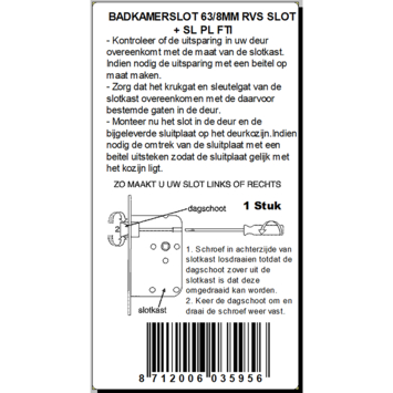 Toilet, wc, badkamer slot met RVS look voorplaat. De dagschoot is makkelijk om te draaien. De afstandsmaat is 63mm tussen het hart van het krukgat en het hart van het wc gat, met een stift van 8mm. De maten van het slot komen overeen met het meest gebruikte slot.