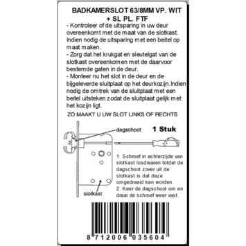 Toilet, wc, badkamer slot met witte voorplaat. De dagschoot is makkelijk om te draaien. De afstandsmaat is 63mm tussen het hart van het krukgat en het hart van het wc gat, met een stift van 8mm. De maten van het slot komen overeen met het meest gebruikte slot.
