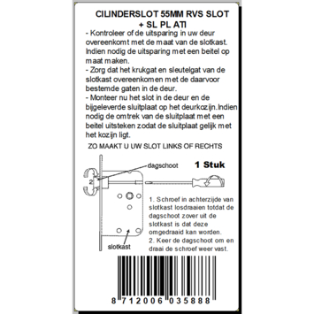 Cilinderslot met RVS slotplaat 55 mm. De dagschoot is makkelijk om te draaien. De afstandsmaat is 55mm tussen het hart van het krukgat en het hart van het ronde deel van het cilindergat. De maten van het slot komen overeen met het meest gebruikte slot.