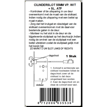 Cilinderslot met witte slotplaat 55 mm. De dagschoot is makkelijk om te draaien. De afstandsmaat is 55mm tussen het hart van het krukgat en het hart van het ronde deel van het cilindergat. De maten van het slot komen overeen met het meest gebruikte slot.