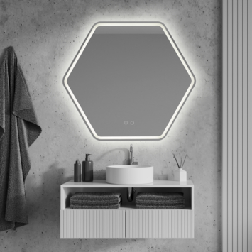 Voeg een vleugje verfijning toe aan je badkamer met de Nora badkamerspiegel. Deze hexagonale spiegel van 70 cm hoog en 79 cm breed is een prachtige aanvulling op elke moderne badkamer. De chroomkleurige afwerking en de elegante lijst zorgen voor een luxe uitstraling die je ruimte meteen transformeert. De Nora spiegel biedt een hoogwaardige LED-verlichting van 12 watt, die zorgt voor een heldere en gelijkmatige lichtverspreiding. Of je nu je make-up aanbrengt of je haar in model brengt, de verlichting levert optimale helderheid voor een perfecte afwerking. Dankzij de kleine touch schakelaar op de spiegel kun je de verlichting eenvoudig bedienen met een simpele aanraking, voor een luxe en gebruiksvriendelijke ervaring. Bij de spiegel ontvang je het benodigde bevestigingsmateriaal, waardoor de installatie eenvoudig en snel verloopt. Het verwarmingssysteem voorkomt condensvorming op de spiegel, zodat je altijd een heldere reflectie hebt, zelfs na een warme douche. Met zijn unieke hexagonale vorm en geavanceerde verlichting biedt de Nora badkamerspiegel een perfecte combinatie van stijl en functionaliteit. Ervaar zelf de luxe en praktische voordelen die deze premium spiegel toevoegt aan je badkamer.