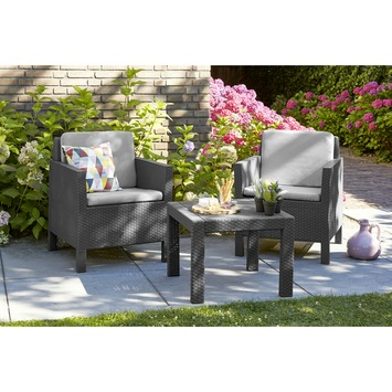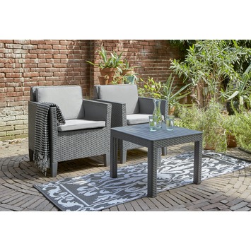 De Chicago balkonset van Allibert is ideaal wanneer u wat minder ruimte te besteden heeft. De balkonset bestaat uit twee stoelen met zit- en rugkussens en een tafel. De set is gemaakt van hoogwaardig kunststof, heeft een wicker uitstraling en rezolithen armleuningen. Dit maakt dat de set zeer modern eruit ziet. U kunt de set het gehele jaar buiten laten staan, daarnaast is de balkonset eenvoudig te monteren.