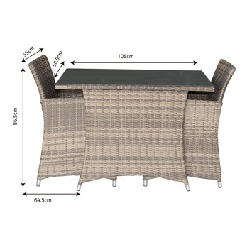 De stoelen zijn 86,5 centimeter hoog, 55 centimeter breed en 64,5 centimeter diep. De bijhorende tafel is 75 centimeter hoog, 66,5 centimeter breed en 75 centimeter lang.