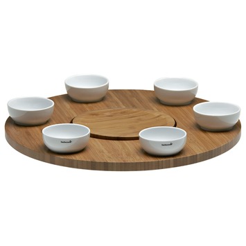 Handige draaitafel van Barbecook voor gebruik in combinatie met de Joya tafelbarbecue. Met 6 kommetjes in keramiek, om te vullen met vlees, vis, groentjes of sausjes. Draaitafel gemaakt uit Hevea hout.
