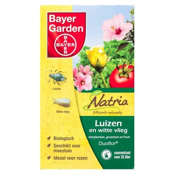 Bayer Natria Duoflor Bladluisconcentraat 250 ml is een 100% biologisch afbreekbaar middel en werkzaam tegen een groot aantal belagers van sier-, groente- en fruitgewassen, zoals groene bladluis, zwarte bonenluis, trips en witte vlieg. De werkzame stof bestaat uit een mengsel van in de natuur voorkomende vetzuren. Omdat Duoflor een natuurlijk middel is, is het heel geschikt voor de moestuin. Het kan vanaf de eerste aantasting tot direct voor de oogst worden toegepast. Ook voor rozen is Duoflor bladluisconcentraat heel geschikt. Herhaal de behandeling na 5-7 dagen. Eén verpakking Bayer Natria bladluisweg duoflor concentraat is geschikt voor 25 liter vloeistof.
