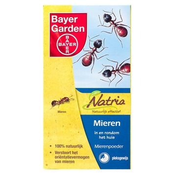 Als de lente komt, laten ook mieren zich weer zien. Bayer Natria mierenpoeder bestrijdt snel en effectief mieren in en rondom het huis. Het poeder verstoort het oriëntatievermogen van de mieren, waardoor de mieren de weg naar het nest niet meer terugvinden en dood gaan. Mierenpoeder bestaat uit natuurlijke grondstoffen. U kunt het ook binnenshuis toepassen. Strooi mierenpoeder op de looppaden van de mieren en buiten ook direct in de buurt van de nestopeningen. Indien nodig de behandeling na enkele dagen nogmaals uitvoeren.