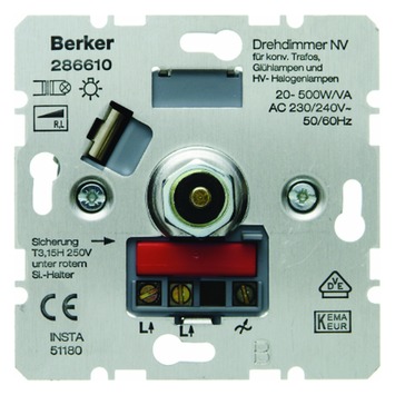 De Berker S.1 Inbouw Dimmer Halogeen Spoeltrafo 20-500W is een functionele inbouwdimmer voor in huis. De dimmer beschikt over een wisselschakeling, zodat je de verlichting vanaf twee verschillende plaatsen kunt instellen. De dimmer is ontworpen met een spoelentrafo, je kunt de dimmer gebruiken voor lampen met een minimaal Wage van 20W tot maximaal 500W. Centraalplaat voor dit basiselement is los leverbaar.