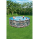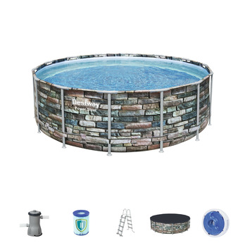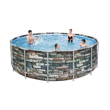 Dit Ronde zwembad met metalen frame gaat voor veel waterplezier zorgen en is makkelijk op te zetten. Het bad heeft een aparte stenen look met een blauw tegelmotief op de bodem. Het zwembad is gemaakt van sterk PVD en de wanden van 3-laags polyester. De onderste band van het zwembad zorgt voor extra versteviging. Het stalen frame is corrosie resistent en uitgerust met het Seal & Lock systeem. Het zwembad beschikt over een filterpomp van 3 m³/u met een anti-microbe filter. Verder wordt het bad geleverd incl. trap, cover en chloordrijver. Watercapaciteit: 15.232 ltr. Afmeting: 427x122 cm