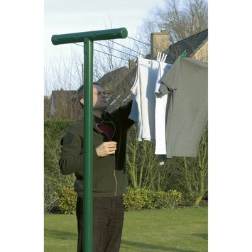 Een stevige tuinpaal waar je meerdere waslijnen op kan spannen? Dat is de Betafence tuinpaal voor waslijn 245cm groen. Deze groene tuinpaal is verzinkt en daarna geplastificeerd, zodat deze zowel corrosiebestendig als makkelijk schoon te maken is. De paal heeft een T-vorm met in het T-hoofdstuk vier verzonken gaten waarin je eenvoudig de waslijnen strak in kunt rijgen. Bovendien is het drogen van kleding in de zon beter voor het milieu en bespaar je op de energiekosten van een mogelijke droger. Kortom: op deze tuinpaal rijg je meters lijn om al je frisgewassen kleding op te laten drogen.