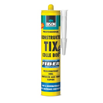 Bison Konstruktie Tix Fiber Koker 325 gr Hoogwaardige, vezelversterkte, tixotrope polyurethaan houtlijm voor binnen en buiten (D4-norm). Watervast en vullend. Handvast binnen 10 minuten. Hecht ook op metaal, steen, beton en kunststof. Voldoet aan eisen EN 204 D4.