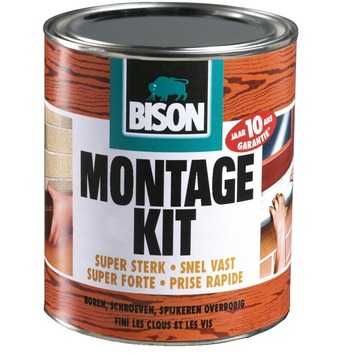 Bison Montagekit Original Blik 750 g Extra sterke, universele, vullende montagelijm. Voor het eenvoudig en muurvast bevestigen van o.a. hout, kunststof, metaal, steen, gips en tegels op allerlei ondergronden zoals beton, steen, pleisterwerk, hout, spaanplaat, metaal en kunststof. Zowel binnen als buiten toepasbaar en geschikt voor het bevestigen van materialen onder spanning. Blijvend elastisch. Spijkers en schroeven overbodig.