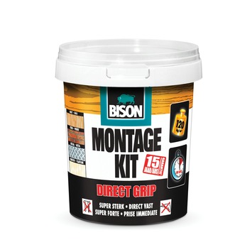Bison Montagekit Direct Grip Pot 850 g Extra sterke, oplosmiddelvrije montagelijm met een extreem hoge aanvangshechting. Voor het super snel en muurvast bevestigen van o.a. hout, kunststof, metaal, steen, gips, tegels en piepschuim op poreuze ondergronden zoals beton, steen, pleisterwerk, hout en spaanplaat. Blijvend elastisch en vullend. Spijkers en schroeven overbodig.