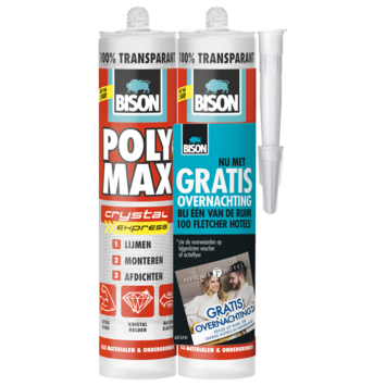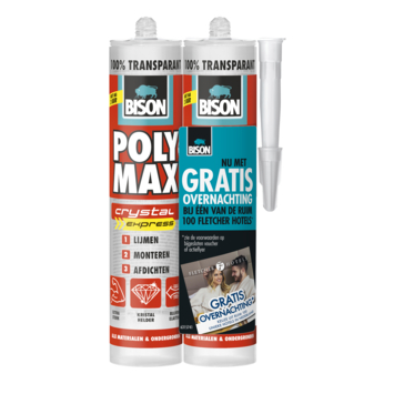 Bison Poly Max® Crystal Koker 300 g Universele, kristalheldere montagelijm en afdichtingskit op basis van unieke SMP technologie. Voor het lijmen, monteren en afdichten van vrijwel alle (bouw)materialen op vrijwel alle ondergronden (glad, poreus, niet-poreus en licht vochtig). Kristalhelder. Extra sterk. Blijvend elastisch.