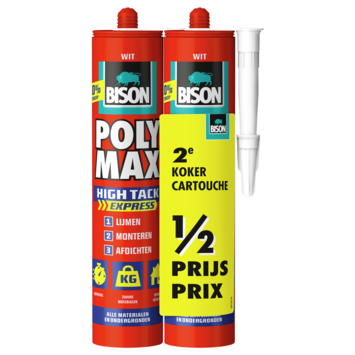 Bison Polymax high tack express wit 2 stuks is een universele, hoogwaardige montagelijm en afdichtingskit op basis van unieke smp technologie, met zeer hoge aanvangshechting en snelle eindsterkte opbouw. Voor het lijmen, monteren en afdichten van vrijwel alle (bouw)materialen op vrijwel alle ondergronden (zowel gladde, poreuze als niet-poreuze ondergronden). Zeer hoge aanvangshechting. Snelle eindsterkte opbouw. Blijvend elastisch.
