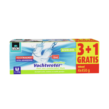 De Bison vochtvreter ambiance magnet 3+1 is het ideale wapen tegen overtollig vocht. Deze vochtvreter bestrijdt vocht, condens, muffe luchtjes, hiermee voorkom je schimmel en een slechte luchtkwaliteit. Uitermate geschikt om te plaatsen in schuur, kelder, caravan, boot, auto of opslagbox.