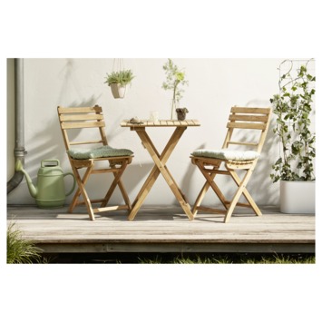 De tafel Rialto hout is een kleine hardhouten bistrotafel. Hij heeft een vierkanten blad van 60 centimeter en is 73 centimeter hoog. Het blad bestaat uit 12 losse planken. Vanwege het hout heeft de tafel een heel natuurlijke uitstraling. De tafel is inklapbaar en dus makkelijk op te bergen. Kortom, de bistrotafel Rialto hout is een zeer praktische tuintafel. Bij de tafel is ook een bijpassende inklapbare stoel te krijgen. Zo heeft u een complete set. Heeft u liever een bistroset in een vintage hout-look ? Deze is in dezelfde Rialto serie ook bij GAMMA verkrijgbaar.