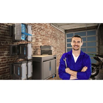 Met de BluCave MIX set creëert u een overzichtelijke werkomgeving. U ruimt spullen snel op dankzij de Rail (2 Bay) en de Systeemkoffer. Zo houdt u uw schuur, garage, werkplaats of werkbus opgeruimd en kunt u efficiënt werken. De veelzijdige systeemkoffer biedt universele en variabele opslagmogelijkheden. Machines, handgereedschappen en losse materialen van alle merken kunnen worden opgeborgen in deze innovatieve opberger. De koffer is draagbaar en eenvoudig te bevestigen aan de muur en wand dankzij de systeemrail. Het transparante deksel zorgt ervoor dat u direct ziet wat er in de koffer zit. U klikt het deksel gemakkelijk los of vast. De systeemrail is gemaakt van RVS en draagt maximaal 2 systeemkoffers. U monteert de rail eenvoudig in bijvoorbeeld schuur, garage, tuinhuis, bijkeuken, werkplaats, bus of balkon. Bevestig de rail, klik de systeemkoffers en boosters erop en voeg naar eigen wens andere producten toe. Inhoud: 1 wandrail voor 2 koffers, 1 systeemkoffer, 2 systeemkoffer verdelers, handleidingen en montagetekeningen