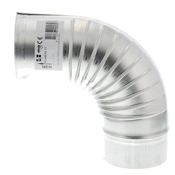 hoogwaardig Dunwandig gefelst aluminium (NEN 7203) Geplooide bocht Ø100mm 90° toe te passen bij geisers Gastec QA en KOMO-keur merken maximale medium temperatuur (continu) 0 - 250°c