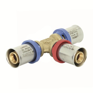 Wil je graag drie leidingen voor drinkwaterinstallaties aan elkaar koppelen? Koop dan de BONFIX Alu-pers T-stuk verlopend 20x2,0x16x2,0x20x2,0mm. De pershuls is gemaakt van RVS, dus minder gevoelig voor corrosie en daarom duurzamer. De diepe ligging van de stevige o-ring in de messing body voorkomt beschadiging van de ring. Dankzij de Leak Before Pressed-functie controleer je snel of de koppeling goed dichtzit, wat lekkages voorkomt. Alu-perskoppelingen koppel je aan flexibele alu-persbuizen die voldoen aan de NEN-norm EN 21003 (meerlaagse leidingsystemen voor warm- en koudwaterinstallaties in gebouwen). Gebruik een speciale perstang met een T-, TH-, of U-bek om de koppeling te sluiten. Dit artikel heeft zowel het KIWA Water Mark als KOMO Keurmerk. Kortom: een goed T-stuk met veel montagegemak.