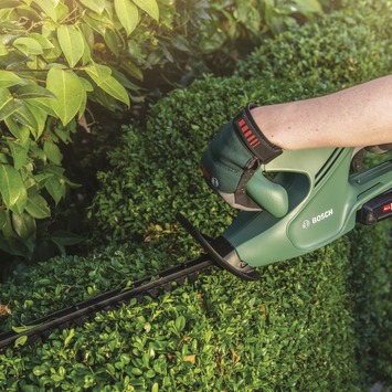 De EasyHedgeCut 18-45 is perfect voor het onderhoud en snoeien van kleine en middelgrote heggen. Hij heeft een uitzonderlijk laag gewicht van 2,3 kg met een ergonomisch ontwerp voor comfortabel hanteren in diverse posities tijdens het werken, voor minder belasting van het bovenlichaam bij langer werken met het gereedschap. De Li-Ion-accu van 18 V levert een optimaal vermogen in combinatie met het Bosch 'Anti-Blocking'-systeem om te zorgen voor uitstekende omstandigheden voor zuiver, krachtig en continu snoeien zonder frustrerende tegenslagen zoals afslaan van de motor. Snoerloze mobiliteit maakt bewegingsvrijheid in de tuin mogelijk zonder de beperking of het risico van doorsnijden van netsnoeren.