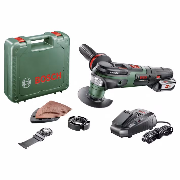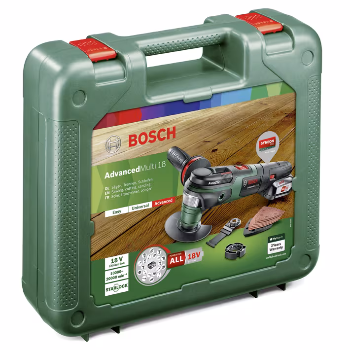 Een handzaam allroundgereedschap op een accu voor alle reparatie- en renovatiewerkzaamheden. Het Bosch multifunctioneel accugereedschap AdvancedMulti 18 heeft een ergonomisch ontwerp en een licht gewicht van 1,4kg. Om deze reden is dit gereedschap makkelijk in het gebruik. Dankzij de 180° LED-lichtband heb je een optimale verlichting van het totale werkbereik. Door de Eco-Electronic wordt de accu gespaard. De geïntegreerde Bosch Syneon-chip zorgt voor meer kracht en biedt meer looptijd per acculading. Hierdoor is het mogelijk om lang te werken zonder pauzes. Dit apparaat wordt geleverd inclusief een groot aantal accessoires, waarmee je het kunt gebruiken voor veel verschillende werkzaamheden. De Bosch AutoClic-technologie zorgt ervoor dat je binnen 3 seconden van accessoire wisselt. Kortom: een multifunctionele machine.