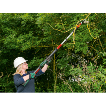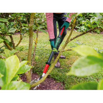 Maak het snoeien van takken in je tuin gemakkelijker met de AdvancedPrune 18V-45 snoeischaar! Deze snoeischaar biedt uitstekende prestaties met minimale inspanning. Dankzij de unieke 360° schakelaar en het slanke ontwerp kun je zelfs op krappe plekken snoeien, ongeacht de werkhoek. De roestvrijstalen messen kunnen zonder problemen zacht hout tot wel 45 mm snoeien, waardoor gezonde groei wordt gestimuleerd. Voor moeilijk bereikbare takken kun je de lengte van de snoeischaar verlengen van 1,2 m tot 1,8 m door gebruik te maken van een apart verkrijgbare verlengsteel. Met de handige haak op het mes kun je gemakkelijk dikke en verstrikte takken bereiken en verwijderen. Bij volledige lading heeft deze snoeischaar dankzij de Quick Cut-technologie een snoeicapaciteit van circa 600 bewegingen bij het snoeien van takken van 30 mm, met een snelheid van minder dan 1,2 seconden per tak. De accuniveau-indicator op de handgreep zorgt ervoor dat je altijd het vermogensniveau in de gaten kunt houden, zelfs tijdens het werken. Dankzij de geïntegreerde Bosch Syneon-technologie ervaar je optimale prestaties en een lange looptijd bij het gebruik van de snoeischaar. Deze snoeischaar maakt deel uit van het 18V POWER FOR ALL-systeem, wat betekent dat je met één enkele accu alle andere 18V POWER FOR ALL-gereedschappen kunt gebruiken. Snoeien wordt zo gemakkelijker en leuker dan ooit tevoren!