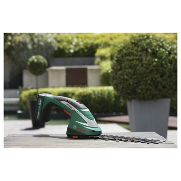 Uw buxus kunt u nu zeer makkelijk onderhouden met de Bosch accu gras- en buxusschaar ASB 10.8 Li. Dankzij de krachtige accu bent u niet afhankelijk van verlengkabels. Deze Litium Ion accu gaat ruim anderhalf uur mee en is binnen 3,5 uur weer helemaal opgeladen. Deze Bosch buxusschaar wordt geleverd met een mes van 20cm en een grasschaar, er passen echter ook andere type messen op deze machine. Het buxusmes heeft een snijbreedte van maximaal 8 mm.