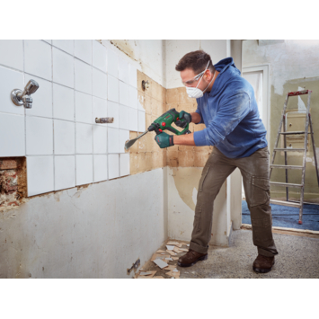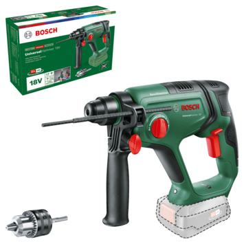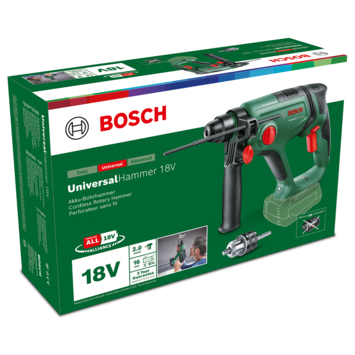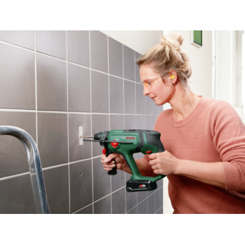 De Bosch UniversalHammer 18V levert optimale flexibiliteit en een indrukwekkend vermogen bij een groot aantal boorklussen. Het ergonomische, praktische ontwerp, minder trillingen en overbelastingskoppeling zorgen voor minder vermoeidheid en meer veiligheid. Deze snoerloze krachtpatser zorgt weer voor plezier bij het boren dankzij de combinatie van een hoge slagkracht, licht hanteren en flexibiliteit. Een pneumatisch Bosch hamermechanisme van 2,0 J wordt aangedreven, wat ideaal is voor het boren van gaten tot max. Ø 16 mm in beton, met een SDS plus-boor. Deze indrukwekkende kracht slaat ook wandtegels los en beitelt kabelgoten. Voor minder vermoeidheid bij langdurige klussen zullen doe-het-zelvers het lichte, compacte formaat van de boorhamer appreciëren. En met de trillings- en rotatieregeling trilt de machine minder en is stabieler.