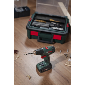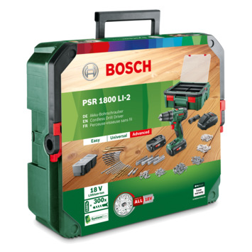 De Bosch accu boormachine PSR1800 + SystemBox is de perfecte totaaloplossing voor doe-het-zelvers die de voorkeur geven aan een zeer praktisch systeem voor het schroeven en boren.