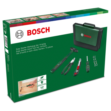 Ontdek de 14-delige Bosch handgereedschapsset Easy Starter. Deze uitgebreide set is speciaal ontworpen voor zowel huishoudelijke taken als doe-het-zelfprojecten, waardoor het de ideale metgezel is voor elke klusser.