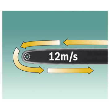 - Kettingsnelheid:12 m/s