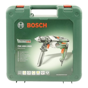 De PSB 1000-2 RCE Klopboor van Bosch is geschikt voor doe-het-zelvers met de hoogste eisen. De boormachine is compleet uitgerust met een krachtige motor van 1000 watt in een robuuste aluminium behuizing en metalen boorhouder met hardmetalen bekken. De dubbeltoerige aandrijving zorgt voor een hoog draaimoment in stand 1 en een hoog toerental in stand 2. De maximale boordiameter is in beton 20mm, in staal 16mm en in hout 40mm. Accessoires kunt u eenvoudig wisselen door de eenhulzige snelspanboorhouder. Dankzij de Bosch Electronic toerentalregeling kunt u fijn gedoseerd werken. De PSB 1000-2 RCE Klopboor werkt bovendien prettig dankzij de geïntegreerde schakelaar, aansluiting voor stofzuiging en kabelgeleiding, waardoor u de boormachine praktisch kunt opbergen.