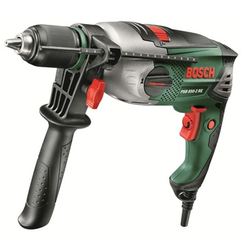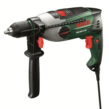 De PSB 850-2 RE Klopboormachine van Bosch is geschikt voor doe-het-zelvers met de hoogste eisen. De boormachine is compleet uitgerust met een krachtige motor van 850 watt in een uiterst robuuste en geïsoleerde aluminium behuizing. De dubbeltoerige aandrijving zorgt voor een hoog draaimoment in stand 1 en een hoog toerental in stand 2. De maximale boordiameter is, afhankelijk van de 1e of 2e stand, 18 of 13mm in beton; 13 of 8mm in staal en 40 of 25mm in hout. Accessoires kunt u eenvoudig wisselen door de eenhulzige snelspanboorhouder. De PSB 850-2 RE Klopboor werkt bovendien prettig dankzij de geïntegreerde schakelaar, aansluiting voor stofzuiging en een nieuwe kabelgeleiding, waardoor u de boormachine praktisch kunt opbergen.