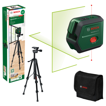 De complete Bosch AdvancedLevel 2G kruislijnlaser set met statief is uitermate geschikt voor renovatie-, decoratie- en onderhoudswerkzaamheden. Deze laser biedt drie verschillende modi: zelfnivellerend laserkruis, zelfnivellerend laserkruis met loodpunten, en een hellingfunctie. Met een nauwkeurigheid van +/- 0,4 mm/m garandeert deze laser uiterst precieze resultaten. De hoogwaardige groene laserdiodes zorgen voor een uitstekende zichtbaarheid van de laserlijnen en een werkbereik tot 15 meter.