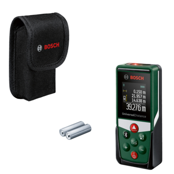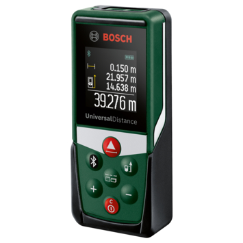 De afstandsmeter UniversalDistance 40C registreert afstanden tot wel 40 meter op twee millimeter nauwkeurig. Uit de gemeten lengtes berekent het toestel automatisch oppervlaktes en volumes. Dat helpt, wanneer u wilt weten hoeveel verf nodig is voor muren en plafonds of hoeveel stof nodig is voor gordijnen. De gemeten en berekende gegevens kunnen via de geïntegreerde Bluetooth-interface voor draadloze datatransfer overgebracht worden naar een gratis app van Bosch. Dat is een uitrustingskenmerk van de laserafstandsmeter zonder concurrentie. Met de app PLR „MeasureOn“, die zowel voor Android- als iOS-toestellen verkrijgbaar is, kan men de meetwaarden bijvoorbeeld in een tekening documenteren en op smartphone of tablet meenemen naar de bouwmarkt voor het kopen van de materialen. Of men stuurt de tekening in PDF-formaat per e-mail naar de schilder of vloerenlegger, dan weet ook hij precies wat hij aan materiaal mee moet brengen.