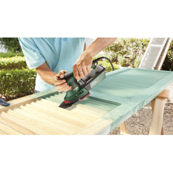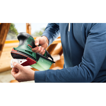 De PSM 200 AES Handpalmschuurmachine van Bosch is een echte allrounder. Dankzij de traploos regelbare toerentalinstelling is de machine geschikt om elk materiaal te schuren. Dankzij de krachtige motor van 200 watt is het apparaat ook opgewassen tegen grotere klussen. Handig is het verwisselbare schuurplateau, waarmee u beschikt over een multi- en vlakschuurmachine in één. Het achterste deel van het schuurplateau blijft in positie, de deltavormige punt is flexibel aangebracht en kan worden gedraaid. Zo kunt u met deze handpalmschuurmachine zowel hoeken, randen als grotere oppervlakken schuren. Met de klithechting verwisselt u snel en eenvoudig het schuurpapier. De stofbox zorgt voor een schone en stofvrije werkomgeving. Kortom: de PSM 200 AES is een waardevolle toevoeging op uw gereedschapsuitrusting.