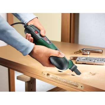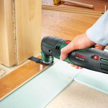 De Bosch multitool PMF 220 E is door een groot aantal accessoires uiterst flexibel inzetbaar. De allrounder is geschikt voor detail-, reparatie- en aanpassingswerkzaamheden zoals zagen, schuren, doorslijpen en krabben. Comfortabel en moeiteloos wisselen van alle accessoires dankzij magnetische gereedschapopname met universele schroef. De Bosch Electronic met traploze instelling van het aantal zaagbewegingen en een oscillatie van 15.000 tot 20.000 bewegingen per minuut in een hoek van 2,8 graden zorgt ervoor dat op het materiaal afgestemd kan worden gewerkt. Dankzij de geoptimaliseerde constructie en het ergonomische ontwerp met een kleine greepomtrek en softgrip produceert de machine zeer weinig trillingen en kan comfortabel worden gehanteerd.