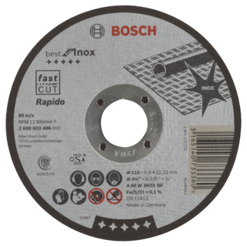 Doorslijpschijf recht Best for Inox - Rapido A 60 W INOX BF, 115 mm, 22,23 mm, 0,8 mm. Doorslijpschijven voor Inox van topklasse voor de hoogste eisen. Passend bij niet-stationaire haakse slijpmachines. Maximale omtreksnelheid: 80 m/s (afhankelijk van toerental en schijfdiameter).