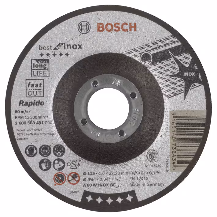 Doorslijpschijf gebogen Best for Inox - Rapido A 60 W INOX BF, 115 mm, 22,23 mm, 1,0 mm. Doorslijpschijven voor Inox van topklasse voor de hoogste eisen. Passend bij niet-stationaire haakse slijpmachines. Maximale omtreksnelheid: 80 m/s (afhankelijk van toerental en schijfdiameter).