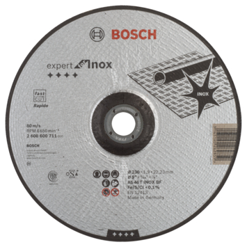 Doorslijpschijf gebogen Best for Inox - Rapido A 46 V INOX BF, 230 mm, 22,23 mm, 1,9 mm. Doorslijpschijven voor Inox van topklasse voor de hoogste eisen. Passend bij niet-stationaire haakse slijpmachines. Maximale omtreksnelheid: 80 m/s (afhankelijk van toerental en schijfdiameter).