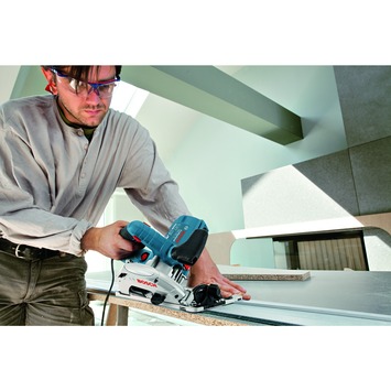 De Bosch Professional cirkelzaag GKS 55+ zaagt moeiteloos door hout en ander materiaal. De cirkelzagen van Bosch zijn robuust en gaan lang mee. Hun krachtige motor zorgt voor een snel resultaat bij het dagelijkse werk op de bouwplaats. Betrouwbaar voeren ze hiermee zelfs de meeste veeleisende taken uit. Deze cirkelzaag is een kleine compacte zaagmachine die uit een cirkelzaagblad bestaat die wordt aangedreven door een motor. Dit Bosch zaagblad heeft vlijmscherpe tanden. Kortom, kaarsrecht door hout, MDF en andere materialen zagen? Gebruik de Bosch Professional cirkelzaag GKS 55+ g.