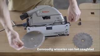 De Bosch Professional inval- cirkelzaag GKT 55 GCE maakt het met het geleiderail systeem gemakkelijk om zeer precies en recht te zagen in diverse materialen. Door de voor en achter vergrendeling los te draaien stel je gemakkelijk een verstek hoek in t/m 47º. Het is eenvoudig een stof/bouwzuiger aan te sluiten op de geïntegreerde stofafvoer.