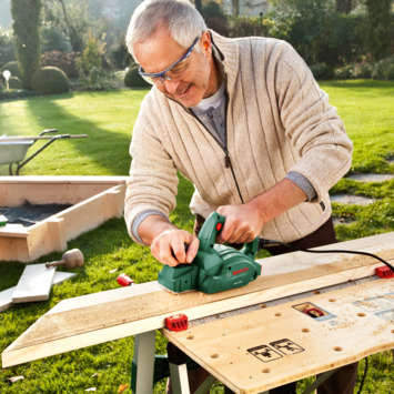 Een lichte en compacte elektrische schaafmachine. De Bosch schaafmachine PHO 1500 is voorzien van het gepatenteerde Woodrazor-messysteem, wat zorgt dat de oppervlaktekwaliteit hoog blijft. De messen bestaan uit fijnkorrelig wolfraamcarbide, een materiaal dat zeer scherp en robuust is. Dankzij de gecombineerde geleidings- en instellingsknop kun je eenvoudig traploos en exact een schaafdiepte tot 1,5mm instellen. Dit is de hoogste schaafdiepte in zijn klasse. De schaafmachine heeft een 550-watt-motor met een toerental van 19.500 omwentelingen per minuut, waardoor hij snel vorderingen maakt. Het afschuinen van randen lukt eenvoudig via de 3 V-groeven van verschillende grootte. Kortom: de perfecte schaafmachine voor verschillende schaafwerkzaamheden.