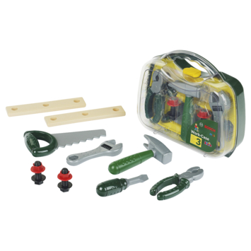 Bosch gereedschapskoffer, medium. Deze transparante koffer heeft een praktisch handvat, zodat je 'm overal mee naartoe kunt nemen! Met talrijke accessoires voor kleine ambachtslieden: zaag, hamer, tang, moersleutel, schroevendraaier, speelgoed hout, schroeven en moeren. Geschikt voor kinderen vanaf 3 jaar.