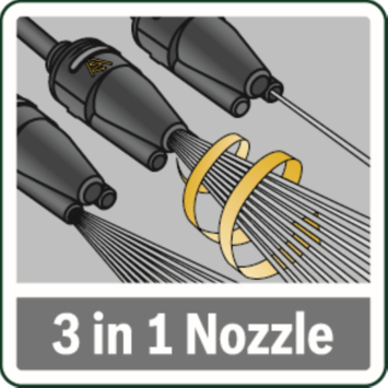 Het unieke 3-in-1 mondstuk biedt drie functies in één: een krachtige straal voor intensief werk, een roterende straal voor hardnekkig vuil en een zachte sproeistand voor het aanbrengen van reinigingsmiddelen. Dankzij de meegeleverde accessoires reinig je zelfs lastig bereikbare plekken, je auto of grote oppervlakken zoals je terras zonder moeite.